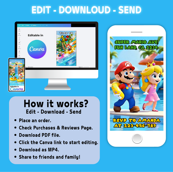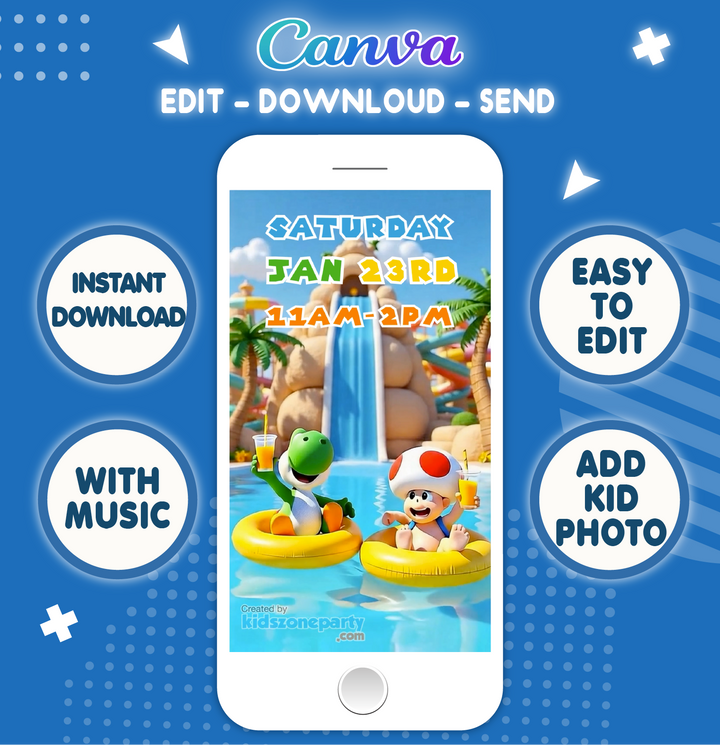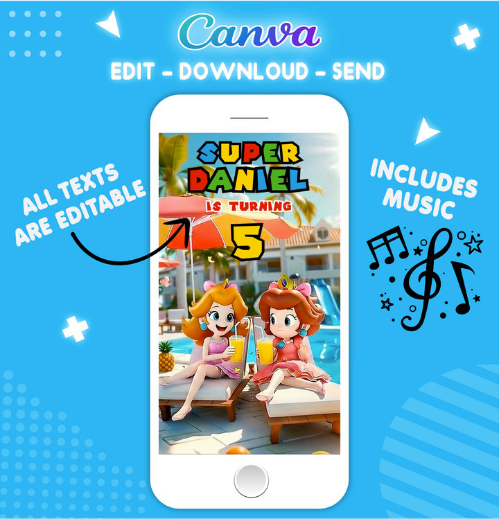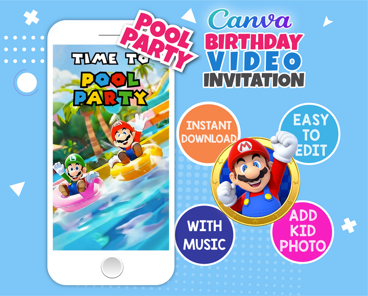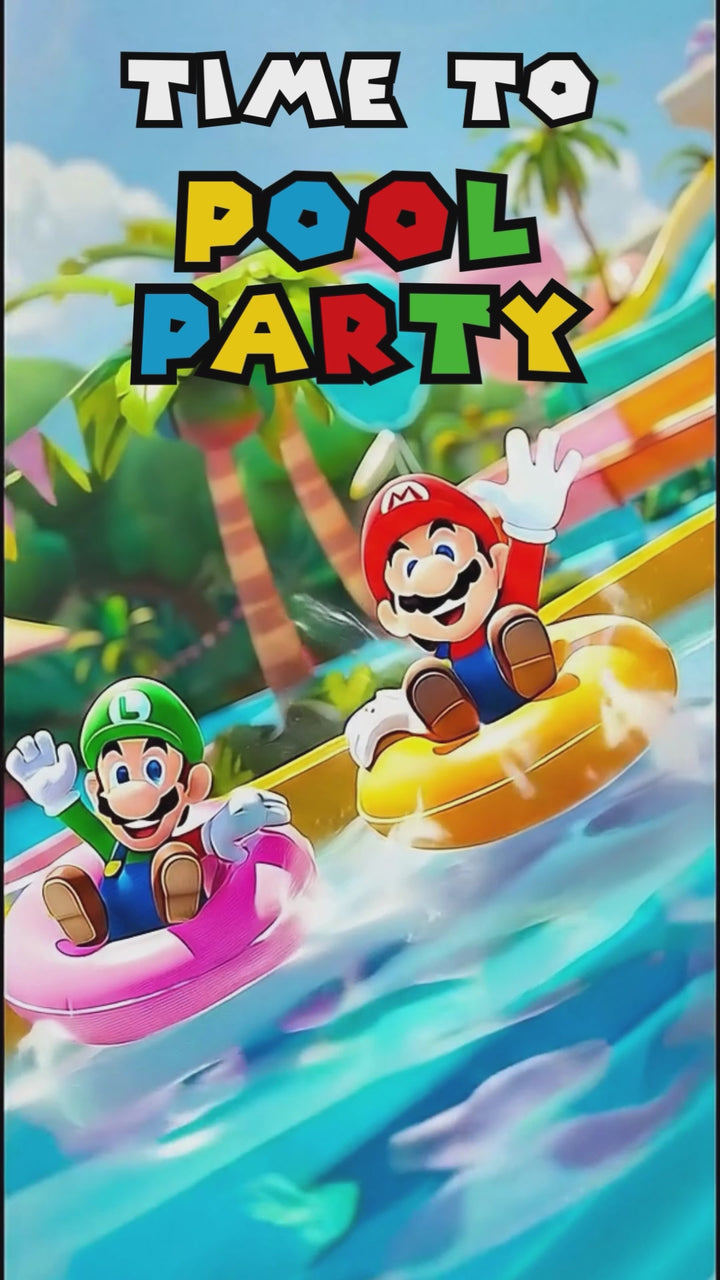 Get ready for an epic pool party adventure with our Super Mario Video Invitation! Featuring Mario, Luigi, Princess Peach, Toad, Yoshi, and Daisy, this animated invitation brings the magic of the Mushroom Kingdom right to your child’s birthday celebration. Perfect for little gamers and Mario fans, this editable Canva template is a fast, eco-friendly, and fun way to invite your guests.